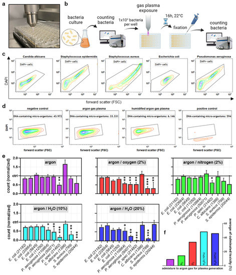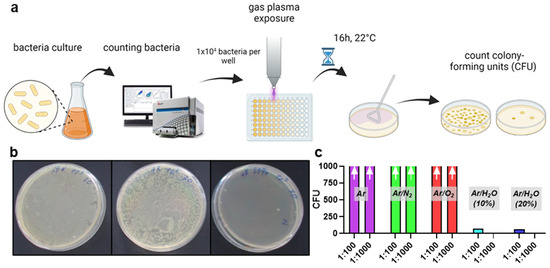 Several types of microorganisms were used in this study, and all were received from the German Collection of Microorganisms and Cell Cultures (Leibniz Institute DSMZ, Braunschweig, Germany). Among them were bacteria, such as Escherichia (E.) coli (DSMZ reference numbers 21182, 22664, 5645, and 1125), Pseudomonas (P.) aeruginosa (DSMZ reference numbers 110864 and 50071) and species (DSMZ reference number 21482), Staphylococcus (S.) aureus (DSMZ reference number 799), and S. epidermidis (DSMZ reference number 20044), and yeast, such as Candida (C.) albicans (DSMZ reference number 1386). Microorganisms were cultured in broth as indicated suitable for each strain type, as DSMZ instructions recommended before gas plasma exposure (Figure 1a).