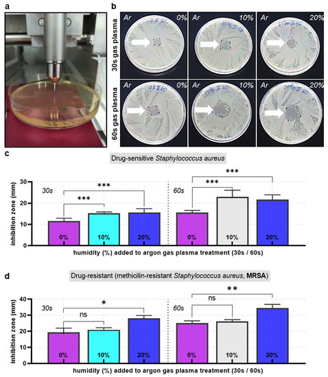 Inhibition zone analysis. (a) image of the kINPen treating S. aureus plated on agar plates; (b) representative agar plates with gas-plasma-generated (treatment times: 30 s or 60 s) inhibition zones for dry and humidified argon feed gas conditions; (c,d) inhibition zone quantification in drug-sensitive (c) and drug-resistant (MRSA, (d) bacteria; data are representative (b) or mean + S.E. of three experiments; statistical analysis was performed using one-way analysis of variances with * = p < 0.05; ** = p < 0.01; and *** = p < 0.001.
