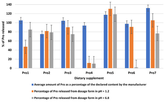 Comparison of the dissolution test results in pH 1.2 (simulated gastric conditions), pH 6.8 (simulated intestinal conditions) with the Pro content analysis for dietary supplements in the dosage form. Comparison of the amount of Pro released and the Pro amount determined in the units, using the extended uncertainty can be found in Table 3.