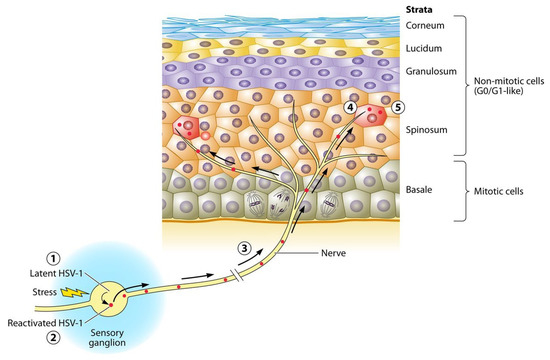 The latent infection of HSV-1 leads to permanent arrest in an G0/G1-like state in the sensory ganglia that will never reenter mitosis ①. During reactivation, virus genes are expressed in cells in the most permissive state ②. Then, reactivated virions travels in axons ③ to termini on the epidermis ④, and then transmitted to the spinosum and granulosum strata layers of the epidermis ⑤ [17].