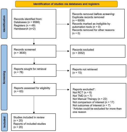 Management options for TMD include occlusal splints, cognitive behavioural therapy, acupuncture, manual therapy, therapeutic exercises, nonsteroidal anti-inflammatory drugs, surgical treatment and others [14,15,16,17,18,19]. Counselling and a conservative approach are generally advocated as a first management choice by health professionals for patients with disabling TMD [19]. Previous systematic review suggested that manual therapy may improve pain intensity, function, and oral health-related quality of life in this population [19]; however, their scope and methods adopted might have compromised the effect estimates presented. These consist of the inclusion of trials that did not adequately compare manual therapy to investigate its effectiveness and the inclusion of non-randomised controlled trials (RCTs) [19]. In addition, the evidence needs updating, as new trials have been published since then. Thus, a new systematic review of randomized controlled trials that methodologically isolate manual therapy to assess its isolate or additional effects is needed to inform the current state of the evidence on this topic.