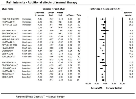 Forest plot of the additional effects of manual therapy on pain intensity at immediate-, short- and long-term. Studies included were: Alajbeg et al., 2015 [35]; Brochado et al., 2017 [38]; Hernanz et al., 2018 [41]; Kanhachon et al., 2021 [43]; Nagata et al., 2019 [47]; Reynolds et al., 2020 [49]; Rezaie et al., 2022 [50]; Sahin et al., 2020 [51]; Serna et al., 2019 [52]; Tuncer et al., 2012.