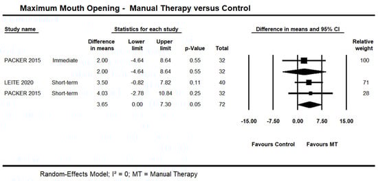 Forest plot of manual therapy versus control on maximum mouth opening at immediate- and short-term. Studies included were: Leite et al., 2020 [45]; Packer et al., 2015.