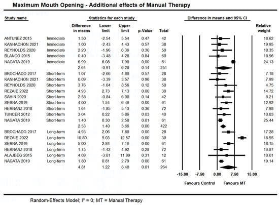 Short-term, high-quality evidence from nine trials showed an additional effect of manual therapy on MMO (95% CI 1.58 to 3.58 mm; I² = 0; n = 494). Sensitivity analysis removing trials with high risk of bias [38] did not suggest an impact on the estimates (95% CI 1.43 to 3.88 mm; 8 trials, n = 394).