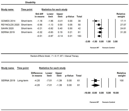 Forest plot of the additional effects of manual therapy on disability short- and long-term. The studies included were: Gomes et al., 2014 [40]; Reynolds et al., 2020 [49]; Sahin et al., 2020 [51]; Serna et al., 2019 [52].