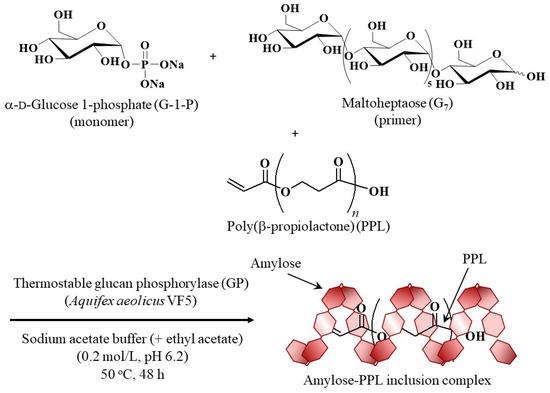 In this study, we investigated the vine-twining inclusion behavior of amylose towards the hydrophobic polyester, PPL, in the thermostable GP-catalyzed enzymatic polymerization. As PPL was not sufficiently dispersed in sodium acetate buffer owing to its highly crystallinity, an ethyl acetate–sodium acetate buffer emulsion system with dispersing PPL was employed as the media for the acceleration of inclusion by the amylosic cavity in the GP-catalyzed enzymatic polymerization. The XRD, 1H NMR, and IR results of the precipitated product supported the structure of the amylose–PPL inclusion complex. From the integrated ratio of the signals in the 1H NMR spectrum, almost perfect inclusion of PPL by amylose was suggested. As this study has indicated that the present emulsion system strongly assists inclusion of PPL by amylose in the GP-catalyzed enzymatic polymerization, a similar system using other poorly dispersed polymers in aqueous media will be performed to obtain new amylosic supramolecular inclusion complexes in the future.