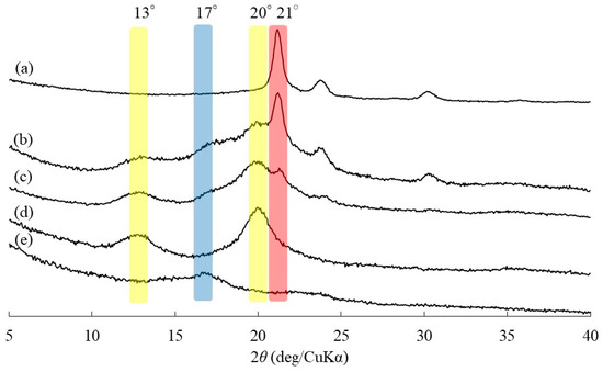 Therefore, the thermostable GP-catalyzed enzymatic polymerization was carried out in the presence of G-1-P and G7 (molar ratio = 280:1) at 50 °C for 48 h in the emulsion system containing the dispersed PPL (Mn = 2230) for the progress of the vine-twining inclusion of amylose towards PPL (Figure 1). The product, precipitated, was separated by filtration, washed successively with water, acetone, and chloroform, and dried. The XRD profile of the product (Figure 2c) mostly detected peaks at 13 and 20° derived from the amylosic inclusion complex (with yellow shadows) and did not, largely, observe peaks at 17 and 21° assignable to the crystalline structures of a double helical amylose and a pure PPL, respectively (with blue and red shadows, Figure 2a,e). The XRD result suggested that vine-twining polymerization progressed well in the above emulsion system to obtain the amylose-PPL inclusion complex. The XRD pattern also suggested the formation of the 61 amylosic helix in the product [37], which were the same conformation in the previously reported amylose-polyester inclusion complexes (e.g., Figure 2d for amylose-PBL inclusion complex) [25].