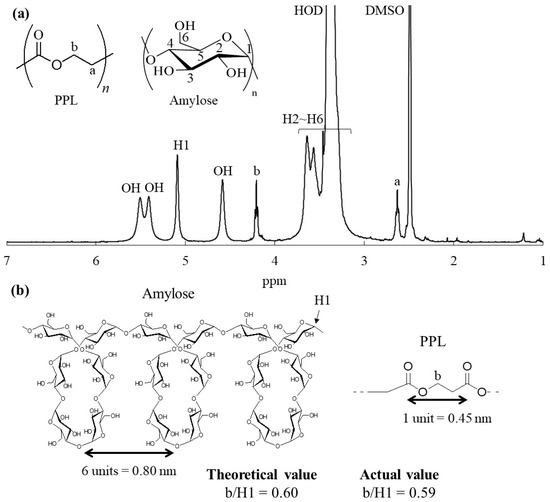 (a) 1H NMR spectrum of product in DMSO-d6 obtained by vine-twining polymerization in ethyl-acetate-sodium acetate buffer emulsion system and (b) illustration of repeat distance of 61 amylosic helix and unit length of PPL.