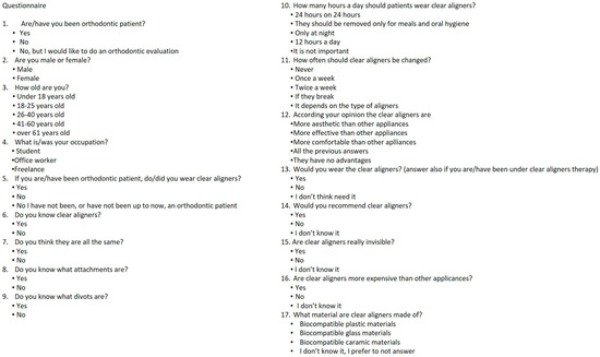 Prior to the study’s inception, an expert panel consisting of three orthodontists and three general dentists filled out the questionnaire. An expert psychometrician checked the questionnaire for common errors. Feedback obtained from experts was used to modify the questionnaire for content and validity, and a first final version was redacted. A subset of 10 participants, corresponding to 10% of the sample of subjects selected for the study, ran a pilot test of the approved version of the questionnaire. After collecting and cleaning the data, an expert statistician used principal component analysis to identify the proper number of elements the questionnaire was measuring. Then, internal consistency was reviewed using Cronbach’s alpha test. With a value of 0.90, the consistency was deemed to be adequate. Based on such criteria, the questionnaire was ultimately approved to be administered in the official test. Adult patients, or at least one parent/legal guardian of underage patients, signed a written informed consent before starting the dental/orthodontic session and/or exam. They were subsequently provided with a smartphone (Huawei (Shenzhen, China), model P smart FIG-LX1, Android system, version 9) on which the oculid app (oculid GmbH, Berlin, Germany) was installed. Through the app, participants were first given a test (in Italian and English) with a questionnaire made up of 17 multiple-choice questions, to be filled in anonymously (Figure 1). The initial questionnaire allowed for the definition of sample characteristics (sex, age range, and profession), the group to which they belonged (orthodontic or non-orthodontic), the level of their knowledge of clear aligners (characteristic components, materials, and management during therapy), and their perception of clear aligners (aesthetics, effectiveness, and costs).