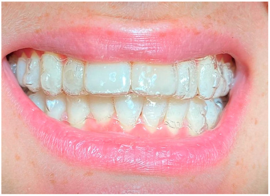 Through the same app session, respondents were asked to observe and evaluate (using star ratings from 1 to 5) 12 smiles (Figure 2, Figure 3, Figure 4, Figure 5, Figure 6, Figure 7, Figure 8, Figure 9, Figure 10, Figure 11, Figure 12 and Figure 13) with different types and designs of clear aligners (differing in terms of margin and number/distribution of attachments). The procedure that led from the multiple-choice test to the rating of the photos with smiles wearing the aligners unfolded in a guided way through explanations that the participants followed step-by-step. The process began with a calibration of eye movements, for which it was required to have adequate environmental lighting and to be without glasses. If either of such conditions went unmet, the app automatically asked for the correction of such elements, possibly also improving and maintaining the most suitable position of the face with respect to the smartphone. The average distance between the subject and the phone display was on average about 30–35 cm, as is the usual distance of use of the smartphone for other functions. The images provided in the app test belonged to three subjects whose mouths were picured with and without clear aligners (one professional photo with cheek retractors and the other with a natural smile). Two of the subjects were being treated with clear aligners equipped with attachments, only posterior in one subject and both anterior and posterior in the other, and a scalloped edge (Invisalign®, Align Technology, San Jose, CA, USA), and the other was in therapy with clear aligners whose system did not include attachments and was equipped with a high-margin, straight, above-the-gingival zenith (Sorridi®, Sorridi s.r.l., Latina, Italy). The choice of providing images with a cheek retractor or with a natural smile was consistent with the intention to evaluate the influence of the lips and their position in the evaluation and overall perception of the clear aligner based on its characteristics (design of the margin and presence and position of the attachments). The six images without aligners (with cheek retractors or with a natural smile) were used as control images during calibration and in order to assess whether the presence of aligners (in the other six experimental images) would affect the evaluation of a natural smile and one with the cheek retractor (with and without attachments). At the end of the multiple-choice test and image evaluation, respondents sent the results directly to the platform. Both the responses and the eye movements were recorded on the images with the clear aligners, which were thus processed both as partial and overall results. The identity of each participant from the platform remained untraceable, both for company operators and investigators. Before use by each patient, the surfaces of the smartphone were sanitized with a surface disinfectant spray (Detrisan AC, Mondial Snc, Limena-PD, Italy) effective against viruses (including coronavirus-type), bacteria, fungi and mycobacteria. The data collected via the multiple-choice test were organized by frequency distribution of the different response options. The data collected on the basis of the evaluation of the images were collected by a star rating for each image (1 star for null approval, 2 stars for poor approval, 3 stars for medium approval, 4 stars for high approval, and 5 stars for best approval), average fixation time of each image, average fixation time of all images, and points of interest (longest fixation time) for each image.