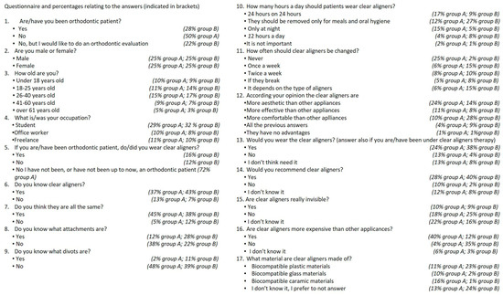 The preliminary part of the test, based on multiple-choice questions, allowed for identification among the respondents of equal shares for each sex and a similar distribution between the non-orthodontic group (group A) and orthodontic group (B); the latter group included orthodontic patients in care, former orthodontic patients, and patients who went for an orthodontic evaluation. In group B, 28% of patients were currently or previously under orthodontic treatment, and 22% of patients in such group wanted to receive an orthodontic evaluation (Figure 14). The distribution by age group in the two groups was as follows: under 18 years old, 19% (10% in group A and 9% in group B); between 18 and 25 years old, 25% (11% in group A and 14% in group B); between 26 and 40 years old, 32% (15% in group A and 17% in group B); between 41 and 60 years old, 16% (9% in group A and 7% in group B); and over 61, only 8% of patients (5% in group A and 3% in group B) (Figure 14). The population of the two groups included 29% of students in group A and 32% in group B, 10% and 8% of office workers and 10% and 11% of freelancers, respectively (Figure 8). Only 16% of patients, belonging obviously to group B, reported having worn the clear aligners during their therapy, while 12% stated they did not use them, and the remaining 72% never used them, not being orthodontic patients (Figure 14). In group A, 37% of the total study subjects responded that they were familiar with clear aligners, whereas the remaining 13% of group A subjects claimed not to be. Such a level of knowledge increased in group B, with an affirmative answer in 43% of cases versus 7% responding in the negative (Figure 14). A total of 45% of the subjects in group A and 38% of the subjects in group B agreed that clear aligners are all the same. Only 5% of patients in group A and 12% in group B believed that aligners are not equivalent in their characteristics (Figure 14). As for specific knowledge of clear aligners, only 12% of patients in group A and 28% of patients in group B stated that they knew what attachments were, versus 38% of patients in group A and 22% of patients in group B admitting that they did not (Figure 14). Knowledge of divots was found to be substantially lower in both groups. In fact, just 2% of patients in group A and 11% of patients in group B knew about divots, while 48% and 39% of both groups A and B, respectively, declared that they did not (Figure 14). A subpar level of knowledge was found regarding usage protocols for aligners. Only 12% of subjects in group A and 27% (which is the highest percentage) in group B correctly stated that clear aligners should only be removed for meals and daily oral hygiene. A total of 17% and 9% of patients in group A and group B, respectively, thought they should be worn all day, while 15% and 5% thought they should be worn while sleeping; only half a day was thought to be enough for 4% and 8%, respectively. Finally, 2% and 1% of patients in groups A and B thought the number of hours of daily use would not be an important factor (Figure 14). Regarding knowledge of the management of aligners, 25% of the subjects in group A believed that aligners should never be replaced. Such a belief was found to be significantly less common in group B, at a mere 2%. A weekly change is recognized as valid for 6% of group A and 15% of group B subjects. A bi-weekly change is considered correct for 8% of the subjects of group A and 10% of the subjects of group B. More concretely, 6% of subjects in group A and 15% of subjects in group B believed the frequency of replacement depends on the type of aligner. Finally, 5% of the subjects in group A and 8% of those in group B thought that the aligners are only to be replaced if they break (Figure 14). The clear aligners were deemed more aesthetically effective by 24% of the subjects in group A and by 14% of the subjects in group B, while they are deemed more effective for 11% and 8% of both groups, respectively, and more comfortable for 10% and 18% of the subjects of the two groups. A lower percentage, 4% of group A and 9% of group B, believed aligners to have all such advantages. On the other hand, 1% of both groups believed that aligners have no advantages (Figure 14). When patients were asked in the questionnaire whether or not they would wear clear aligners, 24% and 38% of groups A and B, respectively, responded affirmatively. In the question, it was clarified that patients in group B had already undergone treatment with aligners, or were doing so at the time of the test. Only small percentages of 13% and 4%, respectively, responded negatively, while 13% of patients in group A and 8% of patients in group B said they did not know (Figure 14). Most patients in group A and group B, 28% and 40%, respectively, said that they would recommend the use of clear aligners. In groups A and B, 10% and 2% of patients would not recommend them, while 12% and 8% were unable to answer such a question (Figure 14). Clear aligners were perceived as truly invisible devices only by relatively few subjects of the two groups: 10% of group A and 9% of group B. According to the opinion of a larger share of patients, 18% of group A and 25% of group B, the aligners are not really transparent. A rather large share of patients from both groups, 22% of group A and 16% of group B, were unable to answer this question (Figure 14). Most non-orthodontic patients, i.e., 40% of group A subjects, believed clear aligners to be more expensive than other orthodontic appliances, unlike 12% of group B patients (i.e., the orthodontic group). Conversely, most orthodontic subjects in group B believed transparent aligners to be no more expensive than other devices (35%). Only 4% of the subjects in group A did not believe them to be more expensive, while 6% expressed no opinion on that. Even 3% of the subjects within group B were unable to answer (Figure 14). Patients in group B were found to be better informed a
