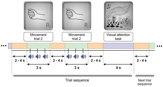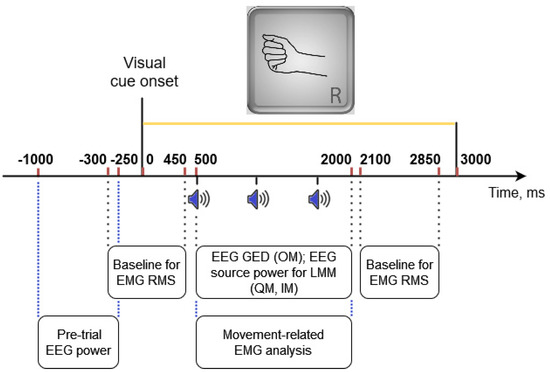 - Extraction of 1.5 s OM epochs related to movement (from the first sound onset to 500 ms after the last sound onset, i.e., +500…+2000 ms relative to the beginning of the trial, which was at the onset of the visual cue, see Figure 3) and 3.5 s epochs related to the visual task (+500…+4000 ms relative to the visual cue onset).