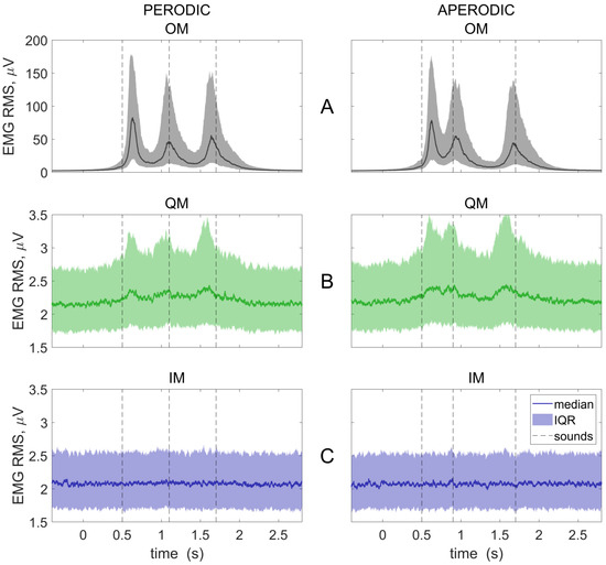 Group averaged EMG RMS time courses for three conditions: OM, overt movements (A); QM, quasi-movements (B); and IM, imaginary movements (C); and two rhythmic patterns (left and right columns). Baseline (−300…450 ms and 2100…2850 ms) was subtracted. Individual trials were collapsed before averaging. The 0 ms corresponds to visual cue onset. Medians and interquartile ranges (IQR) are presented. Vertical lines show the onsets of the sounds, to which the movements should be synchronized.