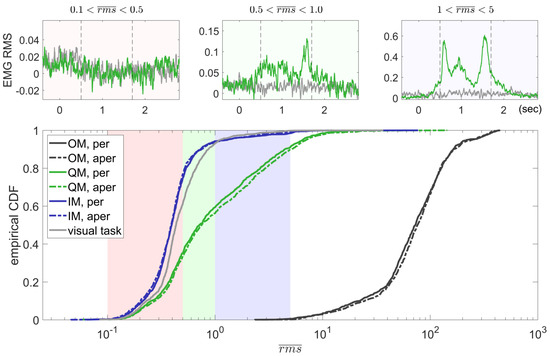 Cumulative distribution functions (CDFs) for values in each condition (Figure 5) indicated that the EMG production was practically indistinguishable between the IM condition and the visual task, as well as between periodic and aperiodic rhythm patterns in each condition. CDFs for the visual task and the IM condition resembled the normal distribution, although the IM distribution had a relatively long right tail. For below 0.5, CDFs for the IM and QM EMG seemed to follow similar (while qualitatively different) distributions, but for above 0.5, the CDFs strongly deviated. The visual inspection of the RMS EMG traces in a significant number of selected trials revealed that the EMG could not be observed in trials with < 0.5, and could often be noticed in the case of > 0.5. The grand averaged EMG RMS time courses for three ranges of in the QM condition confirmed the lack of EMG deviation from the background (visual task) level for trials with < 0.5 (top left subplot in Figure 5), while a deviation from the background level and a clear temporal pattern were evident already in the averaged trial data with the slightly higher EMG level, 0.5 < < 1.0 (top middle subplot in Figure 5). Therefore, 0.5 was set as a threshold to distinguish between the QM trials supposedly without and with the muscle activation (low EMG and elevated EMG trials).