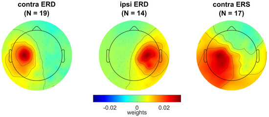 - These precisely tuned spatial filters were then identified using the following procedure, designed on the basis of recommendations by Cohen [14] and Muralidharan et al. [19] and our experience from the studies [11,20]. First, weights approximating the forward models of the sources [21] were computed as A ≈ W−T ≈ WT. Secondly, scalp topographies of the weights in A were visualized for each component, and individual components in the alpha and beta bands were selected by their visual inspection on the criteria that smooth but spatially limited maxima were observed in the sensorimotor areas. Specifically, two alpha band components with maxima in the location ranges FC5..CP1, FCP6..CP2 (the contralateral and ipsilateral sensorimotor areas) were selected from the first five components representing the alpha band ERD (), and one beta band component with maxima in the location ranges F5..CPz (here, only the contralateral area, because no components were found in the ipsilateral cortex) was selected from the last five components representing the beta ERS (). Almost all selected alpha band components were consistent with the radial dipole orientation, while both radial and tangential configurations were seen among beta band components (Figure S2).