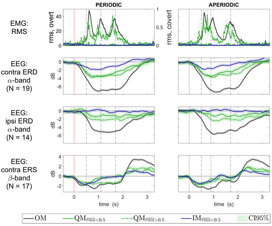 For EMG quantification, we used procedures enabling the detection of relatively short and low-amplitude muscle activations (but, following Nikulin et al. [1], still filtering off very transient muscle activations, which may last just for milliseconds and cannot lead to overt movements), indicating that a movement partly deviated from what is understood as QM. It also might be possible that participants could consciously perceive such movement attempts as different from QMs without muscle activation, and that stronger ERD would reflect their reaction, e.g., to the possible error in following instructions. We also made our ERD/ERS analysis more sensitive to the short-term signs of brain activation.
