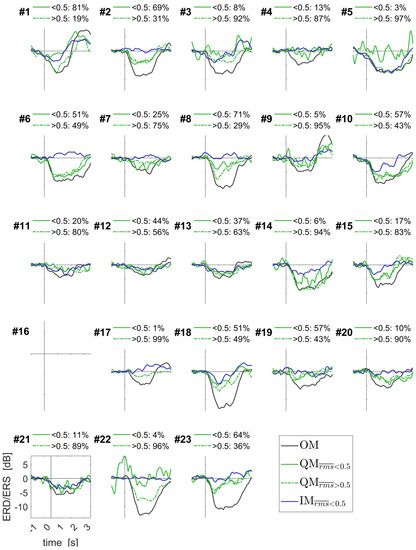 Individually averaged time courses of the ERD/ERS for the contralateral alpha band component of the EEG sensorimotor rhythms. Data for periodic and aperiodic sound rhythms were put together. Individual percentages of trials are shown for QM with low and elevated EMG RMS, as quantified by . See Figure 7 caption for more details and Figures S4 and S5 for other components.
