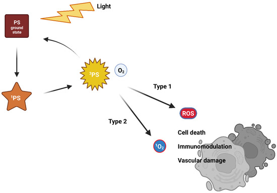 Visible light of a suitable wavelength is used to activate the PS from its ground singlet state with no unpaired electron spins [5,6,7]. The excitation leads to a very unstable and short-lived singlet-excited state [7,8]. As it is very unstable, the PS, therefore, releases excess energy on the nanosecond time scale. For this, it uses photon emission (fluorescence) or internal energy conversion (heat) followed by returning again into the unexcited state. Another mechanism uses the transformation of an excited singlet state to an excited triplet state via one electron spin inversion [9]. The excited triplet state stability is higher compared to the excited singlet state, and so its lifetime is longer. The return to the ground state occurs via a photon emission (phosphorescence—rare at body temperature) or intersystem crossing or transfer of energy to the environment. Interactions with surrounding molecules follows two traditional reaction pathways, called Type I and Type II (Figure 1). With molecular oxygen, an excited PS generates reactive oxygen species (ROS). ROS likely react with surrounding organic molecules, causing oxidative damage that leads to cell death [10,11].