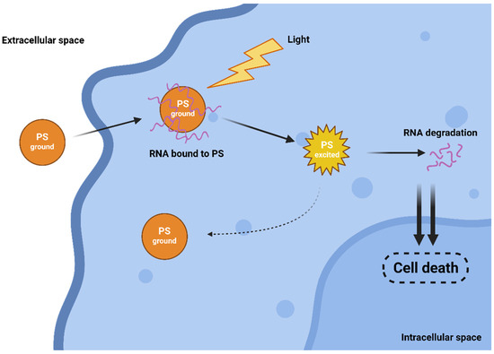 The efficiency of both traditional Type I and II mechanisms is driven by the presence of oxygen, which can be a limiting factor as tumours are often hypoxic. Interestingly, in 2010, a novel and completely oxygen-independent mechanism was described [17]. In this mechanism, excited PSs directly degrade key cellular components, such as proteins and nucleic acids. For example, Yao and colleagues reported the synthesis of novel PSs NBEX, based on Nile Blue, which selectively bind to intracellular RNA, which is then destroyed upon PS excitation (Figure 2) [18]. For such oxygen-independent photoinactivation, the term Type III photochemical pathway is used [19].