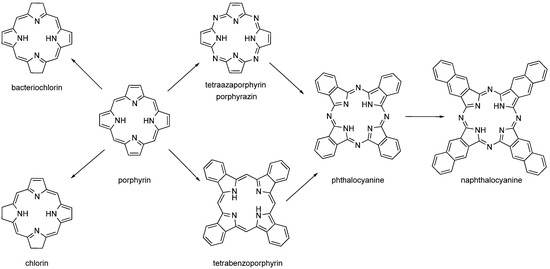 Structures of porphyrin-like compounds (chlorin, bacteriochlorin, porphyrin, tetraazaporphyrin, tetrabenzoporphyrin, phthalocyanine and naphthalocyanine).