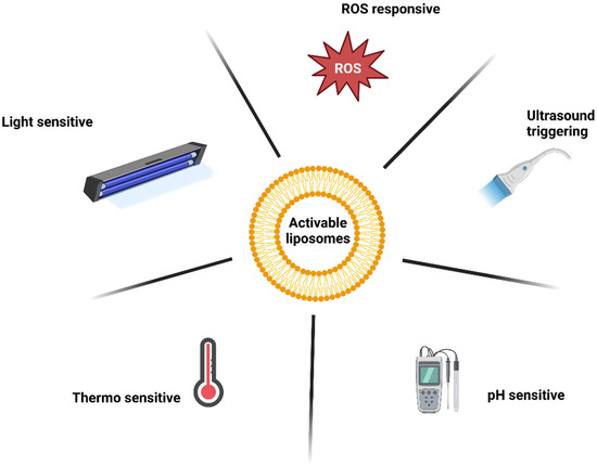 For the reasons mentioned above, liposomes with an activable release strategy are advantageous. These liposomes release PSs upon a particular stimulus, so the PSs can interact with their surroundings. A combination with active tumour cell targeting may provide additional benefit. The various mechanisms for triggered release will be discussed further (Figure 5) [113].