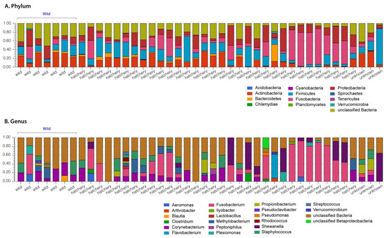 Stacked bar plot overview of the microbial composition of all samples at the phylum level (A) and the genus level (B). Annotation was performed using the SILVA SSU database in MG-RAST. Stacked bars were normalized and the original fish habitat is indicated on the X axis.