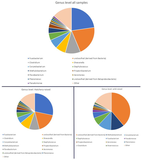 Figure 2 shows a genus-level overview of the bacterial composition of all samples combined. In total, 321 bacterial genera were identified at relative abundances ≥ 0.1%. Only genera with representations > 1% are shown in Figure 2 for clarity. At the genus taxonomic rank, the core bacterial gut microbiome was dominated by Fusobacterium, Clostridium, Corynebacterium, Shewanella, Staphylococcus, Flavobacterium, Propionibacterium, Aeromonas and Methylobacterium. When comparing the genus-level microbiome of the hatchery-raised versus wild-raised samples, the representation of the major genera appears to be very similar (Figure 2 bottom). Although the wild-raised samples appear to contain lower levels of Shewanella and Clostridium, and a higher level of Methylobacterium and unclassified bacteria, the wild-raised samples only compromised 7 samples while there were 34 hatchery-raised samples and overall diversity and multidimensional analyses are needed to determine any potential significant differences (see below). The level of ‘unclassified Bacteria’ of ~20% at the genus level is not unsurprising, given the fact that this analysis is using environmental samples of a newly studied species and many environmental bacterial microbes have not been identified yet.