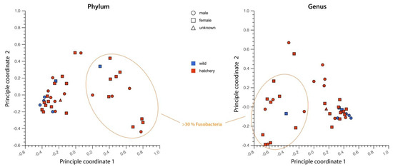 Principal Coordinate Analysis (PCoA) ordination plots comparing the overall bacterial gut microbiome composition of hatchery-raised (red) and wild Pallid Sturgeon (blue) at the phylum level (left) and the genus level (right). PCoA analysis was performed in MG-RAST. Microbiomes that contained 30% or more Fusobacteria are circled in orange.