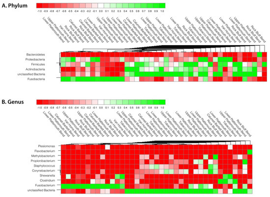 Heat maps and dendrograms of the microbial composition (A) at the phylum level (top-5 phyla and ‘unclassified’) and (B) at the genus level (top-10 genera) versus the sampling location.