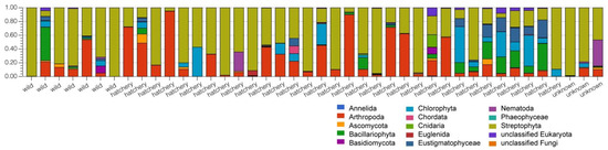 Stacked bar plot overview of the eukaryotic composition of all samples at the phylum level. Annotation was performed using the SILVA SSU database in MG-RAST. Stacked bars were normalized and the original fish habitat is indicated on the X-axis.