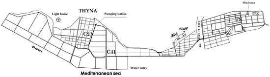 The solar saltern of Sfax (Tunisia, 34° 39′0.1” N and 10° 42′35” E) consists of artificial interconnecting ponds that cover 1500 ha along a 13 km stretch of the Mediterranean coast (Figure 1). Sea salt precipitates under evaporation and is harvested in crystallizing ponds for human consumption. Three autotrophic species: Dunaliella salina (Chlorophyceae), Cylindrotheca closterium (Bacillariophyceae), and Phormidium versicolor NCC466 (Cyanophyceae), were isolated from water samplings collected from TS (mean salinity 346 g L−1), C41 (95.5 g L−1), and C21 (88.6 g L−1) ponds, respectively [2]. Species identification was carried out using morphological criteria, various identification keys, and molecular taxonomy [29,30,31].
