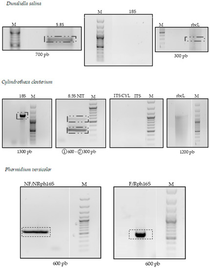PCR amplification for genes representative of Dunaliella: 5.8S, 18S rRNA, and rbcl of Cylindrotheca closterium: 5.8S, 18S rRNA, ITS, and rbcl, and of Phormidium versicolor: 16S. M: Molecular marker.
