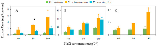 Activities of APX, CAT, and SOD were only detected and measured when cells were grown under E1000 (Figure 4). SOD activity was about two times higher in C. closterium and P. versicolor than in D. salina. This enzyme activity increased significantly in D. salina (F = 24.68, d.f. = 6, p < 0.01), C. closterium (F = 8.67; d.f. = 6; p < 0.05), and P. versicolor (F = 29.78, d.f. = 6, p <0.001) when the salinity increased. The highest CAT activity was measured in C. closterium, and the lowest was recorded in D. salina whatever the salinity. CAT activity increased significantly in each species when the salinity increased (D. salina: F = 8.68; d.f. = 6; p < 0.05; C. closterium: F = 6.20; d.f. = 6; p < 0.05, P. versicolor: F = 8.21; d.f. = 6; p < 0.05). APX activity was not detected in P. versicolor. APX activity significantly increased in C. closterium when salinity increased (F = 23.76; d.f. = 6; p < 0.01), and it stayed almost at the same level in D. salina, whatever the NaCl concentration (Figure 4).