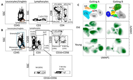 Gating strategy and uMAP clustering of blood cell populations distribution for young (3–7 years old) and old (17–31) monkey group. T-cell population gating strategy (A) and B/NK-cells populations gating strategy (B) are shown. Comparative analysis old and young group of monkeys are visualized for T cell populations Gating A and for B/NK-cells populations Gating B (C).