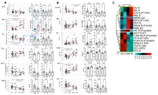 Age related changes in the blood population. The graph displays regression models showing the relation of selected blood populations to animals age (A,B left plots). Regression equation and correlation with the model is shown on each plot. Young and Old animals were presented either by age all together or by age and sex (A,B right plots). Young males (YM) and young females (YF) were included in the sample of 3–7 years old, old males (OM) and old females (OF) were included in the sample of 17–31 years old (A,B right plots). Cluster analysis is presented for all populations that have a significant difference between any two age groups. Colour coding scale shows correlation coefficient (r) level (C). Population name (abbreviation) and explanation—see in the text. Levels of difference significance were indicated as: not significant - ns, (p > 0.05), * (p ≤ 0.05), ** (p ≤ 0.01), *** (p ≤ 0.001), **** (p ≤ 0.0001).
