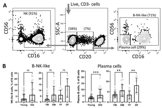 In addition, we analysed the CD3-CD20lo population, which was approximately 70% positive for CD16 and CD56. To analysed the contribution of each marker separately, an additional multicolour analysis was performed (Figure 4A, middle and right plot). CD3-CD20loCD16+ and CD56+ were found to be similar to the NK cell population (Figure 4A, left and right plot). As a result, significant differences with the age of both sexes were found only in CD3-CD20loCD16-CD56- plasma cells. (Figure 4B).