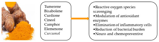 A previous study showed that, following topical Curcumin treatment, the wounds of mice closed rapidly with well-formed granulation tissue that was predominantly composed of deposited collagen and a regenerating epithelium. Furthermore, Curcumin treatment significantly reduced matrix metallopeptidase-9 and tumor necrosis factor alpha and sped up the healing of wounds in mice via controlling the amounts of different cytokines [50]. Several potential effects of Curcumin essential oils are illustrated in Figure 4.