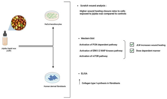 Jojoba liquid wax (JLW) wound healing properties examined by western blot, ELISA and scratch wound analysis on in vitro human dermal fibroblasts and keratinocytes [77].