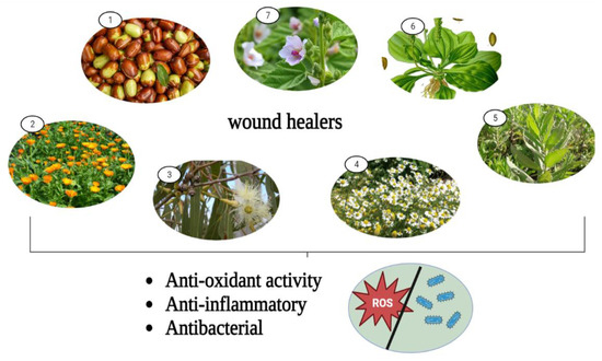 Pharmacological wound healing activities of some remarkable medicinal plants. 1: Jojoba, 2: Calendula officinalis, 3: Eucalyptus, 4: Chamomile, 5: Inula, 6: Plantago major, 7: Althea officinalis.