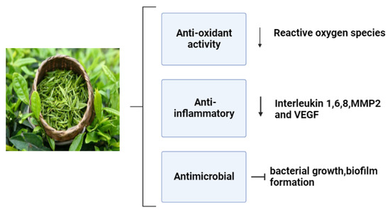More than two-thirds of the world’s population drink tea, including green tea brewed from the leaves of the Camellia sinensis plant [100]. One of the oldest and most widely consumed beverages worldwide, it is made from the Camellia sinensis (L.) plant (green tea) and is mostly grown in Japan, China, and Taiwan [101]. Green tea has been demonstrated to have positive impacts on human health, including effects against cancer, obesity, diabetes, heart disease, infections, and neurological disorders [102].