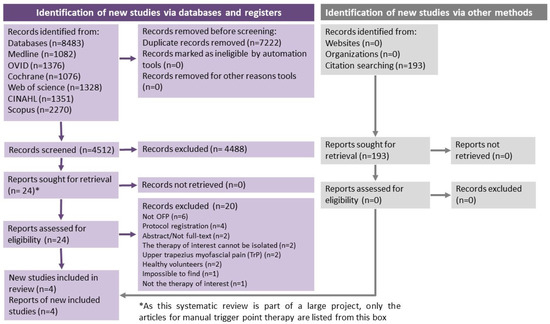 This systematic review has some strengths and limitations that need to be addressed at this point. The literature searches were performed by an experienced health sciences librarian. This enabled accurate identification of possible studies from the respective databases. In addition, our systematic review did not limit on the basis of language and we searched from 1946 to April 2021 (i.e., database inception to date of last search). Our inclusion criteria were also broad since our objective was to include all studies looking at manual trigger point therapies. Despite these broad criteria and the thorough search conducted, only four studies were found that met our criteria for inclusion. Furthermore, this review was the first to specifically investigate manual trigger point therapy in patients with latent mTrPs in muscles of the orofacial region. Nevertheless, the most common condition reported on was TMD.