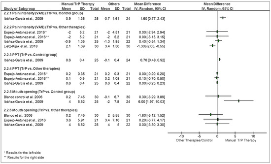 Forest plot for qualitative comparison of manual TrP therapy vs. any other therapy or controls used in the analyzed studies. Pain is reported in cm, pressure pain thresholds (PPT) in kg/cm2, and mouth opening in mm).