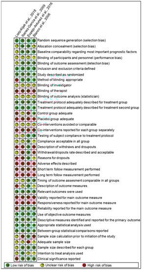 The risk of bias (RoB) is summarized in detail in Appendix E and Figure 3. All the included studies for this systematic review used a random sequence generation, provided well defined inclusion and exclusion criteria for their populations, and gave a detailed description of the protocols used for treatment. However, all of them had some methodological flaws (Appendix E). Questions regarding the interventions revealed that the treatment protocol was inadequately described by all included studies, as some details of exposure were not reported. Therefore, the reproducibility of these interventions is not possible.