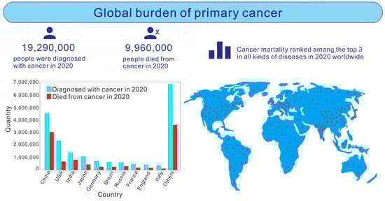 Cancer is one of the most difficult medical problems in the world today. It is a public health problem that seriously threatens human life and health [1,2,3]. According to research statistics [4,5,6], among various diseases, the mortality rate of malignant tumor is the second highest, second only to cardiovascular and cerebrovascular diseases. In the last 20 years, the incidence rate and mortality rate of cancer have been rising at a rate of 20% each year. Figure 1 shows the development trend of cancer patients in the world. The World Health Organization’s International Agency for Research on Cancer (IARC) has released data on the global burden of cancer for 2020, which looks at incidence and mortality rates for 36 cancer types in 185 countries. As can be seen from the picture, in 2020, there will be 19,290,000 new cancer patients and 9,960,000 deaths worldwide. The top 10 countries in the number of cancer patients are China (4,568,754, 23.7%), the United States (2,281,658, 11.8%), India (1,324,413, 6.9%), Japan (1,028,658, 5.3%), Germany (628,519, 3.3%), Brazil (592,212, 3.1%), Russia (591,371, 3.1%), France (467,965, 2.4%), England (457,960, 2.4%) and Italy (415,269, 2.2%). Others (6,936,010, 36%) refer to the number of cancer patients in 175 other countries, including Canada, Indonesia, Mexico, Iran and Turkey, which also have a large number of cancer patients. Due to the increasing variation in the number of people in each country, countries with a larger population base in this study also had more cancer cases. According to the statistics in the literature [7], due to the different genital systems and endocrine levels of males and females, there will be significant differences in cancer prevalence between the sexes. For example, women get metrocarcinoma, ovarian cancer and carcinoma of vulva. In men, prostate cancer occurs and carcinoma of the testis occurs. Breast cancer also varies by gender, with 99.07% of occurrence in women and 0.93% in men. In oral cancer and pharyngolaryngeal cancer, the proportions of males and females were 71.67% and 28.33%, respectively. The proportion of male and female thyroid cancer patients was 28.95% and 71.05%, respectively. In cancers of the digestive system, such as esophagus cancer, gastric cancer, intestinal cancer, colon cancer, rectum cancer, liver cancer, gallbladder carcinoma and pancreatic cancer, the proportion was 56.36% male and 43.64% female, respectively. Among respiratory cancers, such as laryngocarcinoma and lung cancer, 51.58% were male and 48.42% were female, respectively. Among the patients with bone cancer, 55.24% were male and 44.76% were female. Among skin cancer patients, 57.91% were male and 42.09% were female. Among leukemia patients, 59.04% were male and 40.96% were female. With the continuous development and progress in science and technology and medical technology, cancer treatment methods, such as surgery, chemotherapy and cell-based therapy, have made great progress [8,9,10]. However, due to the complex pathogenesis of cancer, it is very difficult to treat it. Therefore, cancer prevention and search for efficient and low recurrence cancer treatment methods have always been difficult and topical issues in the field of cancer prevention and treatment.