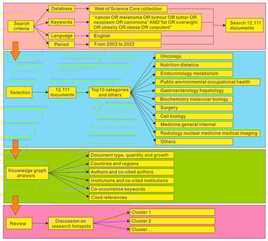 Cancer is caused by many factors, including genetic factors, endocrine factors, immune factors, lifestyle (smoking), environmental pollution (diet, air), ionizing radiation, etc. A large survey in the internationally famous medical journal The Lancet shows that obesity and being overweight will increase the risk of cancer, and body mass index (BMI) (weight divided by the square of height) is significantly related to a variety of cancers [11,12,13]. Obesity is usually accompanied by a series of diseases, such as hypertension, hyperlipidemia, coronary heart disease, diabetes, cardiovascular and cerebrovascular diseases, and endocrine diseases, which have a huge impact on people’s health [14,15,16,17,18,19]. The main reason why obese people are prone to cancer is that patients often have hyperinsulinism and hyperlipidemia. Hyperlipemia reduces the immunity of the body, so that the ability of immune cells to recognize and kill tumor cells will be relatively weak, so the incidence rate of cancer has increased accordingly [20]. An article [12] published in the medical journal The Lancet tallied a population-based cohort study of 5.24 million UK adults. The analysis showed that overweight and obese people were significantly more likely than the general population to develop the following 10 types of cancer. According to the ranking, they are: cervical cancer (62%), gallbladder (31%), kidney (25%), liver (19%), colorectal cancer (10%), cervical cancer (10%), thyroid cancer (9%), leukemia (9%), ovarian cancer (9%) and breast cancer (5%). In order to deeply explore the correlation between cancer and obesity and the research hotspots and trends in recent years, this study will use knowledge mapping technology to analyze and discuss the literature.
