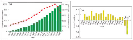 Total amounts and changes of documents on cancer and fat ((a). Document publication in 2003–2022. (b). ChangeTrend of annual publication of literature.).