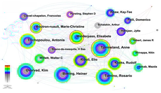 After the academic papers published by scientific researchers are included in the database, other researchers will retrieve information through the database and quote the article. The more articles published, the higher the frequency of citation and the greater the influence of the author in this field. We use the knowledge map to analyze the number of articles published by authors and the cooperation between authors. Figure 7 is the knowledge graph of authors who published articles. The round node in Figure 7 represents the author. The larger the circle and font, the more documents the author sends. The connection between nodes indicates the communication and cooperation between authors. The thicker the connection, the more documents the author sends through cooperation. Table 1 shows the author information of the top 10 articles published. It can be seen from Table 1 and Figure 7 that Tjonneland and Anne, who published 54 academic papers in the field of the relationship between cancer and obesity in the past 20 years, had the largest number of published articles. Next, is Overvad, Kim, who have published 51 academic papers in this field. Then, Boeing, Heiner (48), Trichopoulou, Antonio (44), Tumino, Rosario (43), Riboli, Elio (40), Kaaks, Rudolf (38), Weiderpass, Elisabet (37), Boutron rault, Marie (34), Khaw, Kay Tee (32). Tjonneland, Anne, Trichopoulou, Antonia, Tumino, Rosario, Weiderpass, Elisabete and others have worked closely with other authors. These authors have carried out a lot of exploration and research in the research on the relationship between cancer and obesity, proving their influence in this field.