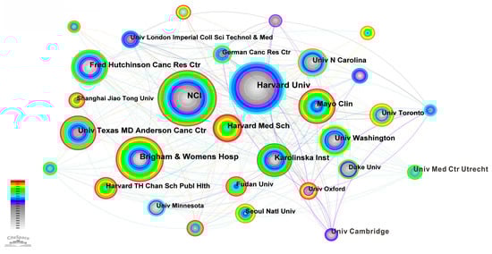 We use the knowledge map to analyze the number of articles published by institutions and the close cooperation between them. Figure 8 is the knowledge graph of research institutions. The circular nodes in the figure represent the research institutions. The larger the circle and font, the more articles published by the institutions. The connection between nodes indicates the communication and cooperation between research institutions. The thicker the connection, the more articles published by institutions. Table 2 shows the top 10 research institutions in terms of the number of published articles. It can be seen from Table 2 and Figure 8 that Harvard University in the United States has published the largest number of articles in the research on the relationship between cancer and obesity, and this institution has published 299 academic papers in the past 20 years. Next is the National Cancer Institute, which has published 265 academic papers in this field. Then, Brigham & Womens Hospital (199), University Texas MD Anderson Cancer Center (165), Harvard Medical School (154), Fred Hutchinson Cancer Research Center (145), Mayo Clin (143), Karolinska Institution (139), University of Washington (127) and University North Carolina (109). It can also be seen from Figure 8 that University Cambridge has cooperated closely with other scientific research institutions and published a large number of papers in the past 10 years. The above-mentioned scientific research institutions have made great contributions in tackling the difficult problems in cancer medicine.