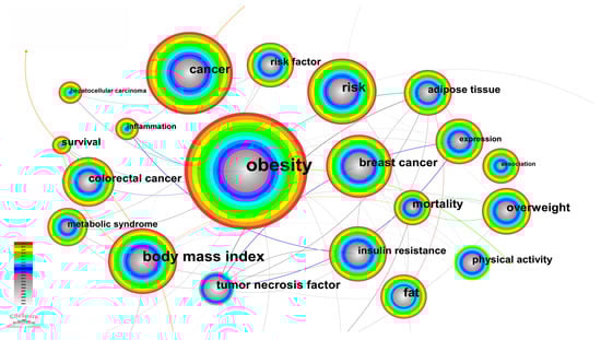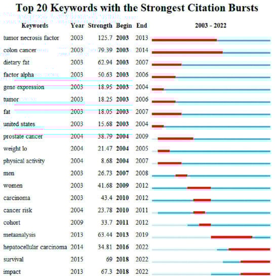 Keyword is a high profile of the research content of an academic journal, which reflects the essence of an article. Through the co-occurrence analysis of keywords in a large amount of the literature on the relationship between cancer and obesity, we can discover research hotspots and development trends in this field [41]. In our research, we set the number of highlighted keywords to 20. Through the keywords analysis function, we obtain the keyword knowledge Graph 9 and the top 20 keywords with the strongest citation bursts Graph 10. We can clearly see in Figure 9 that in the keyword research on the relationship between cancer and obesity from 2003 to 2022, the frequency of occurrence of obesity is the highest, and the associated keywords of cancer, breakthrough cancer, body mass index and risk are also very high. At the same time, popular studies on the relationship between obesity and cancer in the past 20 years also include the women’s breast cancer and body mass index. In addition to the several popular keywords mentioned above, expression, overweight, fat, adipose tissue, risk factor, colorectal cancer, insulin resistance, etc., also appear with high frequency. Tumor necrosis factor and expression, as well as insulin resistance and inflammation, are a group of keywords with high frequency, showing high relevance.