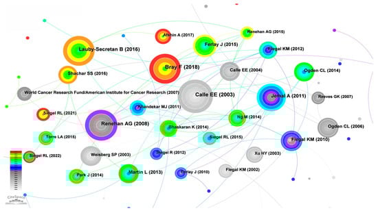 It can be seen from the knowledge graph in Figure 11 that Calle EE, Bray F, Lauby secretan B, Renehan AG, Jemal A and others are the top authors cited with the highest frequency, which fully proves their influence in this field. Calle EE published the earliest article, which belongs to the most classic literature in the field. From the analysis, it can be concluded that the article published by the author Bray F. is a relatively new article from 2018, which has been cited 220 times and is also the most classic literature in this field in recent years. The results of the statistical analysis of the first 10 highly cited references are shown in Table 3. In terms of the year of publication, the literature was published and cited from 2003 to 2021, which is the basic literature and classic literature in this field. The articles of Calle EE and Bray F have been cited extensively, with a frequency of 220. Ogden CL has two articles that have been cited in the top 10, including 89 times for articles published in 2014 and 82 times for articles published in 2006. Next, we will briefly introduce the 10 most highly cited articles.